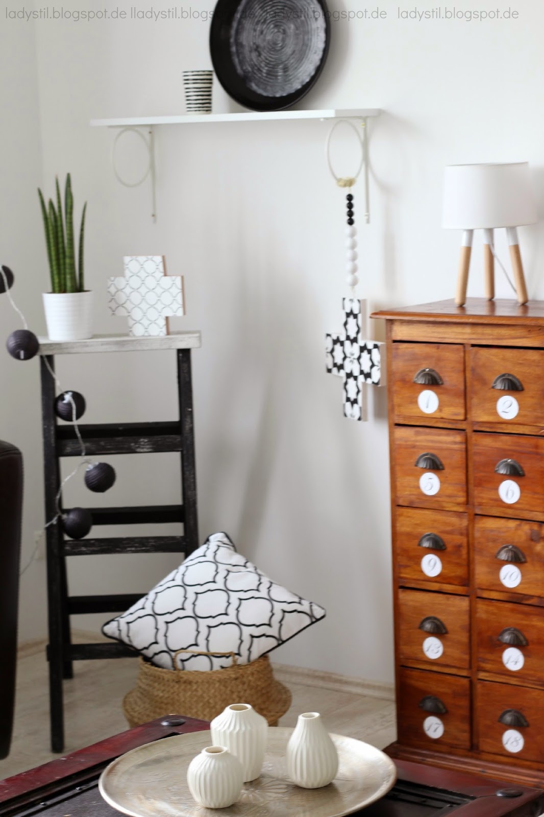 Ecke des Wohnzimmers mit schwarzer Leiter Kommode Regal und vielen Dekoartikeln wie Kreuzkette, Vasen und Kissen in schwarz weiß
